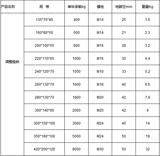 調(diào)整墊鐵使用方法:將墊鐵放置于機(jī)床下,每個(gè)墊鐵均受力后,再調(diào)整墊鐵??烧{(diào)整高度為3-15mm。調(diào)整墊鐵適用范圍:金屬加工機(jī)床,鍛壓機(jī)床、紡織機(jī)械、印刷機(jī)械、食品加工機(jī)、橡膠機(jī)械、電線生產(chǎn)機(jī)械、電纜機(jī)械、包裝機(jī)械、發(fā)電機(jī)及重型設(shè)備等。